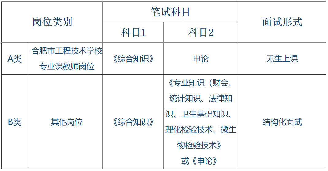 1.笔试工作由巢湖市人力资源和社会保障局统一组织,采取闭卷形式进行,考试科目根据岗位类别如下表: